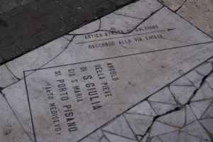 Entriamo nel merito di cosa stiamo parlando: su un lato di via Grande vi è una lapide di marmo indicante l’antica via di Salviano, raccordo per l’Emilia e l’angolo della Pieve di Santa Giulia, già Santa Maria di Porto Pisano (alto medioevo). Questa lapide fu posizionata negli anni ’50 a indicazione di vecchie vie cittadine. Non sembra un bene quindi preservato dalle Belle Arti e potrebbe essere tranquillamente rimosso, ma sarebbe un peccato dal momento che si parla di Santa Giulia la nostra Patrona.