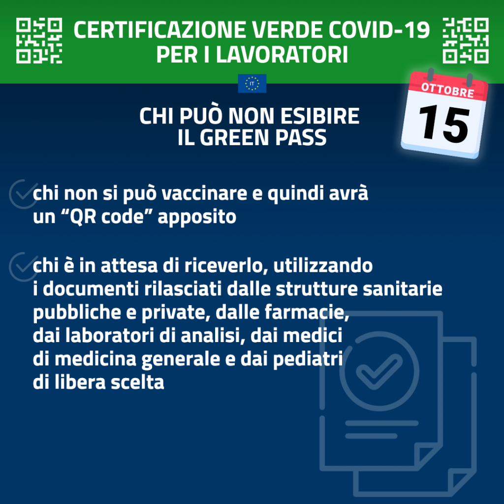 I soggetti che, per comprovati motivi di salute, non possono effettuare il vaccino contro il COVID-19, dovranno esibire un certificato contenente l’apposito “QR code” in corso di predisposizione. Nelle more del rilascio del relativo applicativo, il personale esente – previa trasmissione della relativa documentazione sanitaria al medico competente dell’amministrazione di appartenenza – non potrà essere soggetto ad alcun controllo.