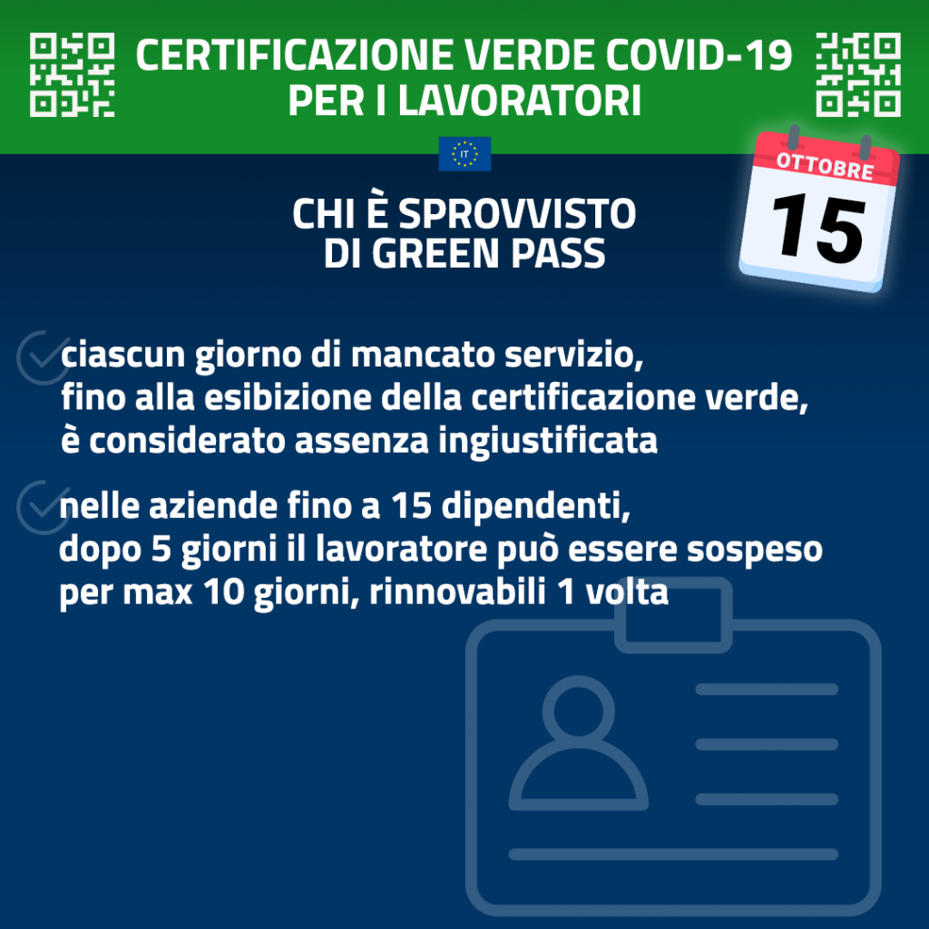 Il lavoratore, pubblico o privato, è considerato assente ingiustificato, senza diritto allo stipendio, fino alla presentazione del green pass; nel caso di aziende con meno di 15 dipendenti, dopo il quinto giorno di assenza ingiustificata, il datore di lavoro può sospendere il lavoratore per la durata corrispondente a quella del contratto di lavoro stipulato per la sostituzione, comunque per un periodo non superiore a dieci giorni, rinnovabili per una sola volta.