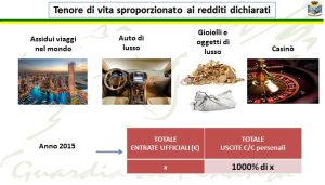 Gli indagati avevano un tenore di vita sproporzionato ai redditi dichiarati, facevano viaggi nel mondo, possedevano auto di lusso, gioielli e oggetti di lusso e frequentavano Casinò. Nel 2015 nelle dichiarazione dei redditi veniva indicata una cifra x al fisco, ma dalle loro uscite personali sui conti correnti bancari a loro intestati vi erano movimenti del 1000% superiori a quello dichiarato al fisco.