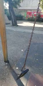 Panchine senza assi; altalena rotta, assi di sicurezza della pista di pattinaggio a raso terra mancanti; scarsa manutenzione delle piante; rifiuti abbandonati in terra; un carrello della spesa tra le siepi; i bagni pubblici chiusi.