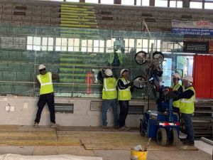 Questa mattina sono iniziati i lavori per la messa in sicurezza del Palamacchia. Si tratta di una prima parte del lavoro, verranno smontate le vetrate, le se sedie di legno che non sono ignifughe e verrà spostata la ringhiera per lasciare uno spazio di un metro e venti centimetri nel corridoio tra la scalinata ed il campo.