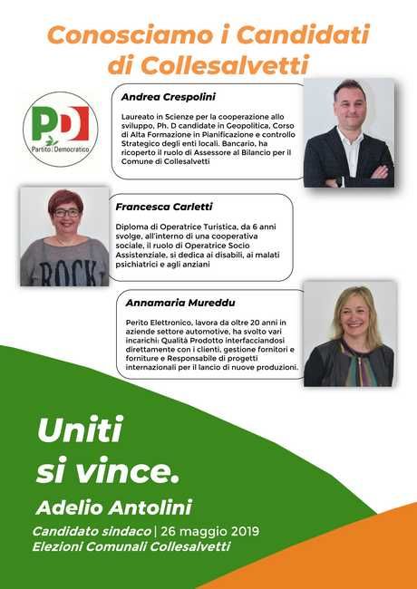 A Collesalvetti il candidato sindaco  ADELIO ANTOLINI, sarà  accompagnato “oltre che dalle altre forze politiche e civiche, da un gruppo di 16 candidati consiglieri comunali, con una larga partecipazione femminile, con tanti giovani preparati, con lavoratori impegnati nei tanti settori della nostra società, con numerosi indipendenti che saranno al loro primo impegno amministrativo, ma che – nella loro attività – nell’associazionismo, nel volontariato ed oltre, hanno già dimostrato il loro valore“.
