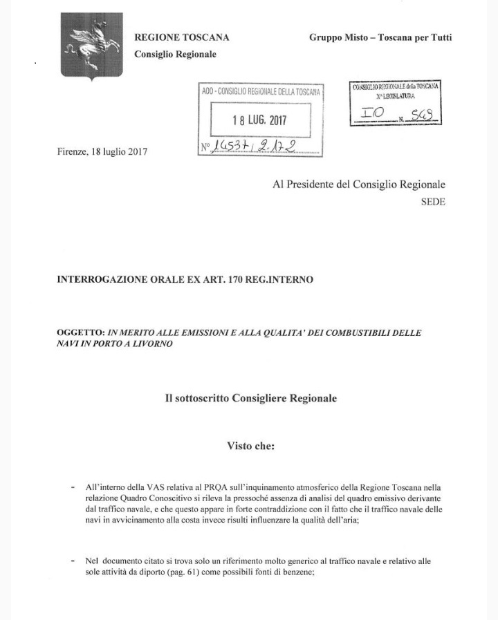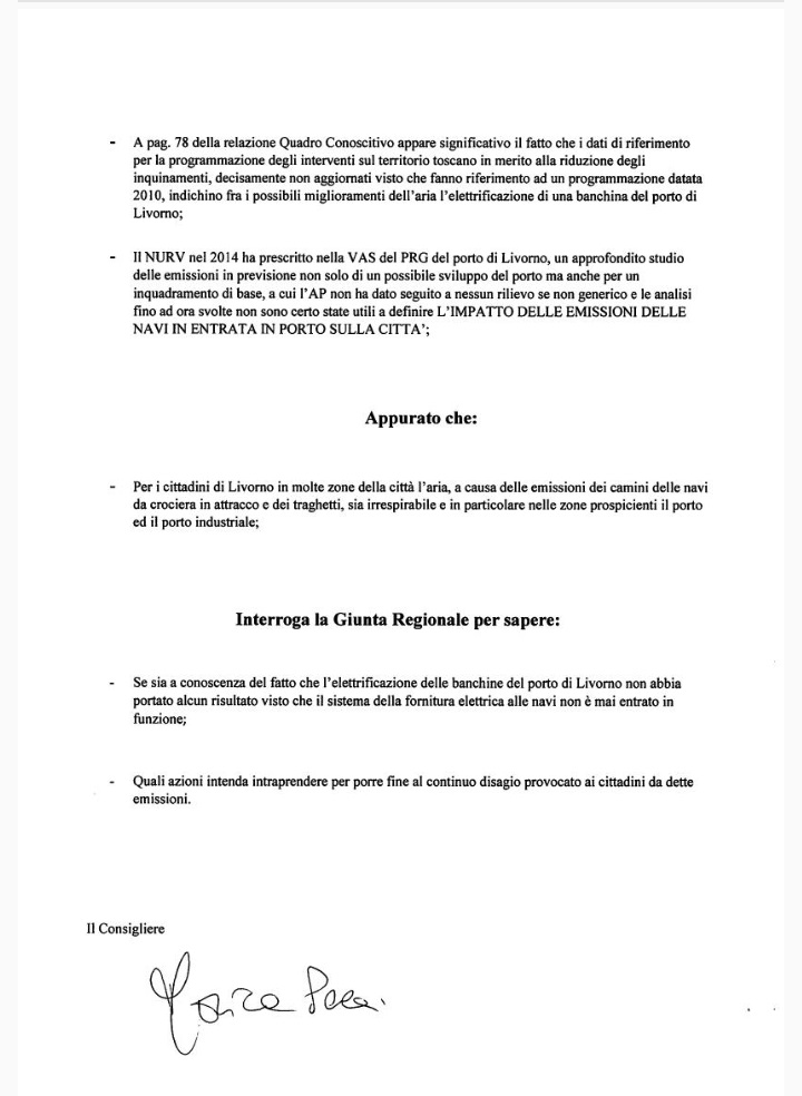 “Nella Valutazione Ambientale Strategica relativa al Piano Regionale sulla qualità dell’aria della Regione Toscana, nella relazione Quadro Conoscitivo, è pressoché assente l’analisi relativa al derivante dal traffico navale, con dati riferiti oltretutto ad una programmazione del 2010 che indica fra i possibili miglioramenti dell’aria l’elettrificazione di una banchina del porto di Livorno; elettrificazione che non ha portato ad alcun risultato visto che il sistema della fornitura elettrica alle navi non è mai entrato in funzione.