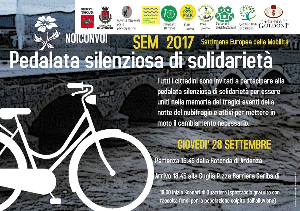 Di fronte al dramma che ha colpito Livorno, Fiab Livorno e Pandaciclisti del WWF Livorno, con la collaborazione dei Quartieri Uniti EcoSolidali, Condomini Uniti EcoSolidali, il Coordinamento Livorno Porto Pulito, la Fondazione Teatro Goldoni e il patrocinio del Comune di Livorno e della regione Toscana, hanno deciso di fare, per la Settima Europea della Mobilità, un solo evento di mobilità ATTIVA: una pedalata silenziosa, per dare un messaggio di solidarietà, di vicinanza e di sostegno a chi è stato così duramente provato.