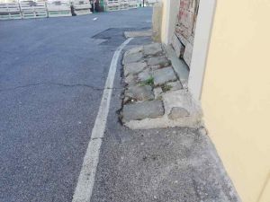 Proseguendo il percorso del marciapiede incontriamo scalini di abitazioni che ne riducono l’utilizzo e addirittura uno scivolo in pietra per l’accesso a un fondo che però per il pedone o per il disabile creano uno scalino.