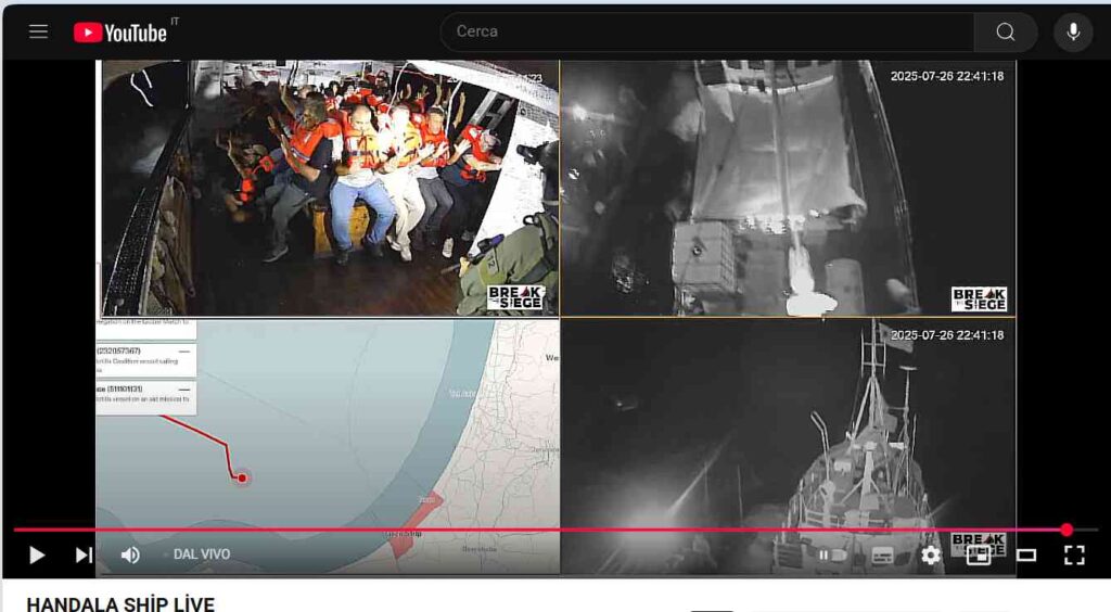 La Coalizione della Flottiglia della Libertà conferma che la sua nave civile Handala, in rotta per rompere il blocco illegale e genocida di Israele contro i palestinesi a Gaza, è stata violentemente intercettata dall’esercito israeliano in acque internazionali a circa quaranta miglia nautiche da Gaza. Alle 11:43 ora della Palestina, l’occupazione ha spento le telecamere a bordo di Handala e abbiamo perso tutte le comunicazioni con la nostra nave. L’imbarcazione disarmato trasportava rifornimenti salvavita quando è stata abbordata dalle forze israeliane, i suoi passeggeri rapiti e il suo carico sequestrato. L’intercettazione è avvenuta in acque internazionali al di fuori delle acque territoriali palestinesi al largo di Gaza, in violazione del diritto marittimo internazionale.