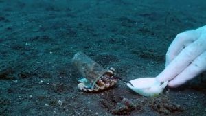 Plastica: Polpo cambia casa, lascia il bicchiere di plastica per una conchiglia