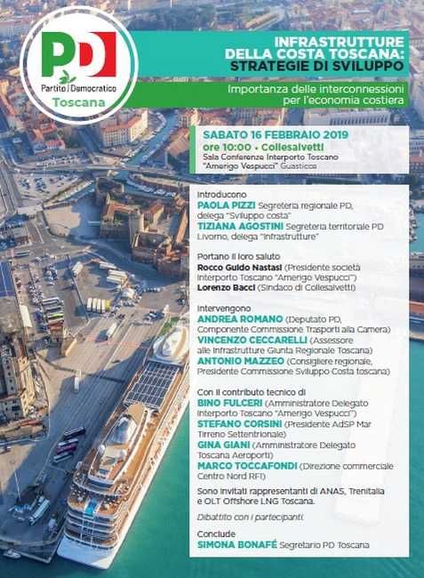 I relatori politico-istituzionali saranno Andrea Romano (parlamentare PD) , Vincenzo Ceccarelli (assessore regionale alle infrastrutture), Antonio Mazzeo (presidente commissione costa); quelli tecnici invece saranno: Stefano Corsini (AdSP), Toscana Aereoporti (Gina Giani) , Interporto Vespucci (Bino Fulceri) , OLT , Anas, RFI. Le conclusioni saranno affidate all’on. Simona Bonafè (parlamentare Europea PD e Segretaria Regionale Toscana PD).