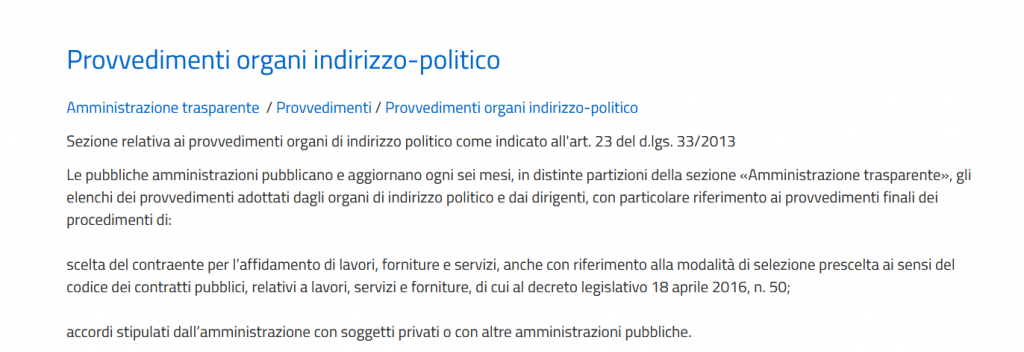 Probabilmente, ci chiediamo, vi sarà un link ben visibile nella “sezione amministrazione trasparente” / “Provvedimenti”. Ma anche qui solo parole e nessuna indicazione pratica: