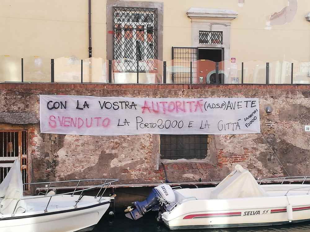 Porto2000, due striscioni di protesta esposti questa mattina lungo i fossi, davanti all’Autorità di Sistema Portuale due striscioni di protesta