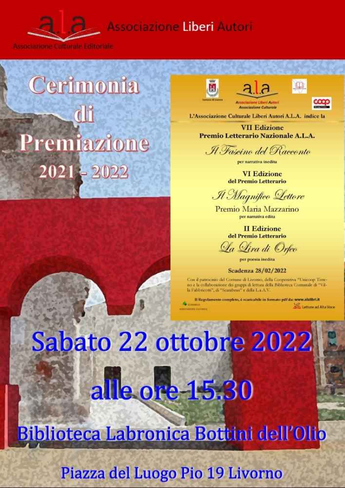 la cerimonia di premiazione del premio letterario A.L.A. 2022 giunto alla VII edizione si terrà sabato 22 ottobre 2022 alle ore 15. 30 presso la sede dei Bottini dell’olio della Biblioteca Comunale in Piazza del Luogo Pio a Livorno.