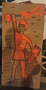 Disegnata infatti su un cartone la figura di un uomo con un elmo in testa ed uno scudo nella mano sinistra mentre; al posto della spada brandita in aria con la mano destra, un fiasco di vino. Come sfondo la torre della Meloria, uno dei simboli di Livorno e teatro di battaglie per la contesa dei mari in epoca medioevale