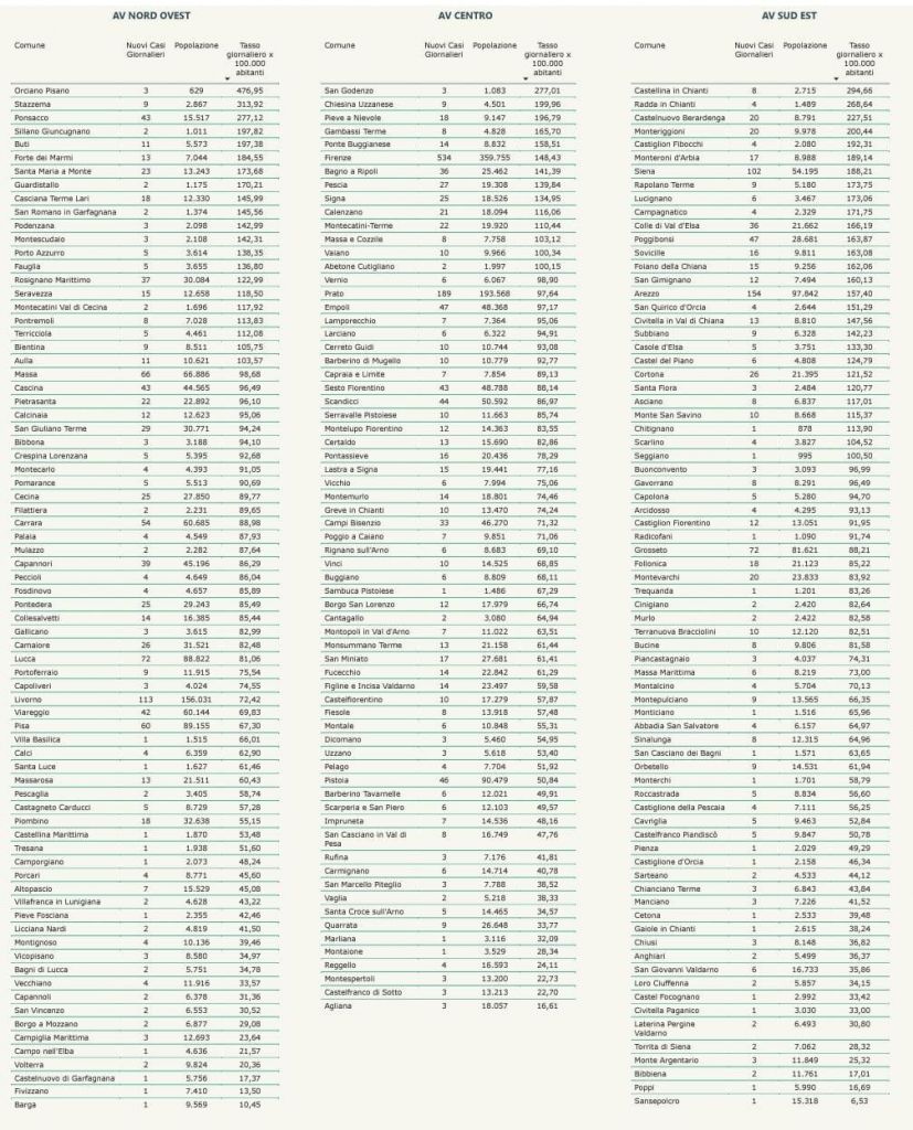 Sono 90.170 i casi complessivi ad oggi a Firenze (1.014 in più rispetto a ieri), 28.845 a Prato (234 in più); 30.957 a Pistoia (214 in più), 17.236 a Massa (160 in più), 32.997 a Lucca (284 in più), 37.849 a Pisa (360 in più); 25.221 a Livorno (238 in più), 29.602 ad Arezzo (321 in più), 20.102 a Siena (359 in più), 14.236 a Grosseto (153 in più).