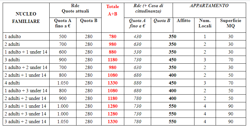 una Quota B del Rdc non più fissa a 280 € per gli affitti ed a 150 € per i mutui, come è adesso; ma libera di variare insieme alla Quota A in funzione dell’effettiva necessità del nucleo familiare.