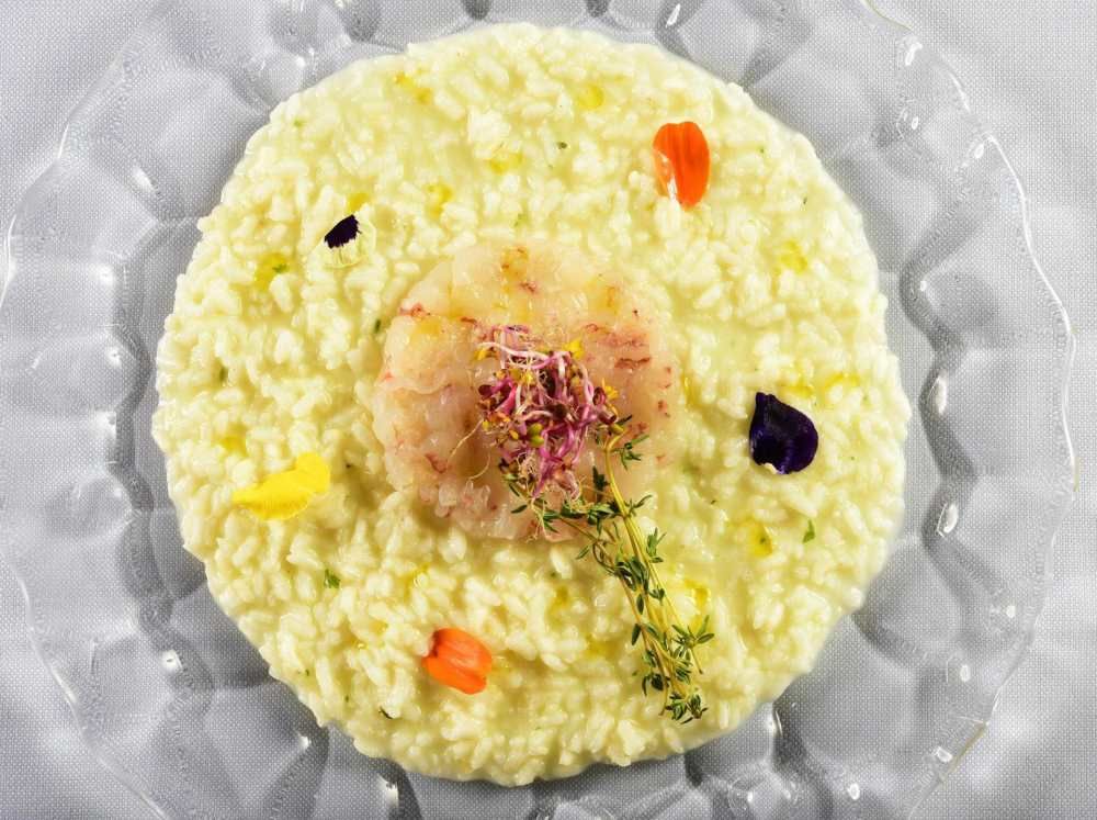 Iniziare a tostare il riso in un pentolino con olio e cipolla tritata. Iniziare a bagnare poco per volta con il brodetto preparato in precedenza. A cottura ultimata spegnere il fuoco e mantecare il riso con olio e il succo del limone filtrato. Mantecatura all’onda. Lasciar riposare 2 minuti e impiattare il riso in un piatto piano e adagiare sopra il disco di tartare di scampi. Guarnire il piatto con foglioline di erbette fresche e petali di fiori eduli.