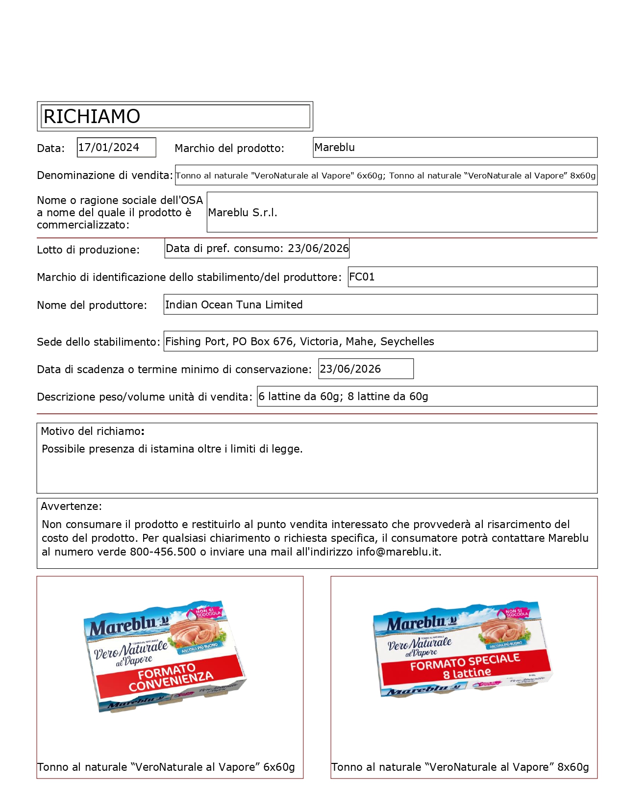 RICHIAMO Data: 17/01/2024 Marchio del prodotto: Tonno al naturale “VeroNaturale al Vapore” 6x60g; Tonno al naturale “VeroNaturale al Vapore” 8x60g