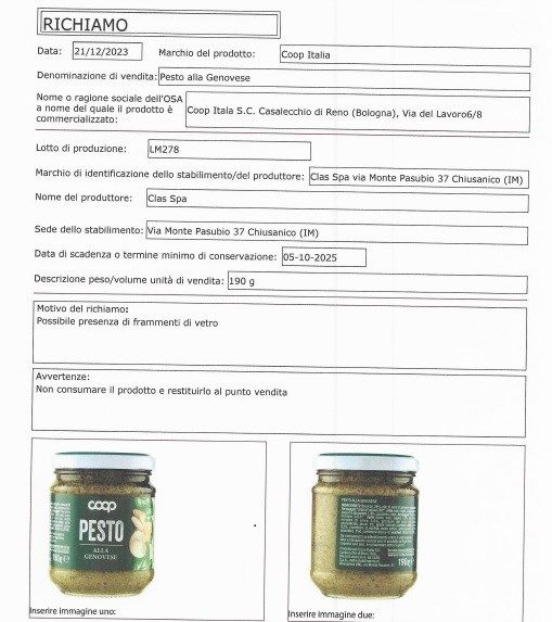 22 dicembre 2023 – Richiamo precauzionale lotto Pesto alla Genovese, possibili frammenti di vetro