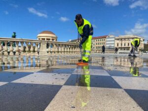 Utilizzate mini-spazzatrici e idro-pulitrici per pulire accuratamente tutto il piazzale a “scacchiera”. La conclusione dell’attività è prevista nella giornata di domani.