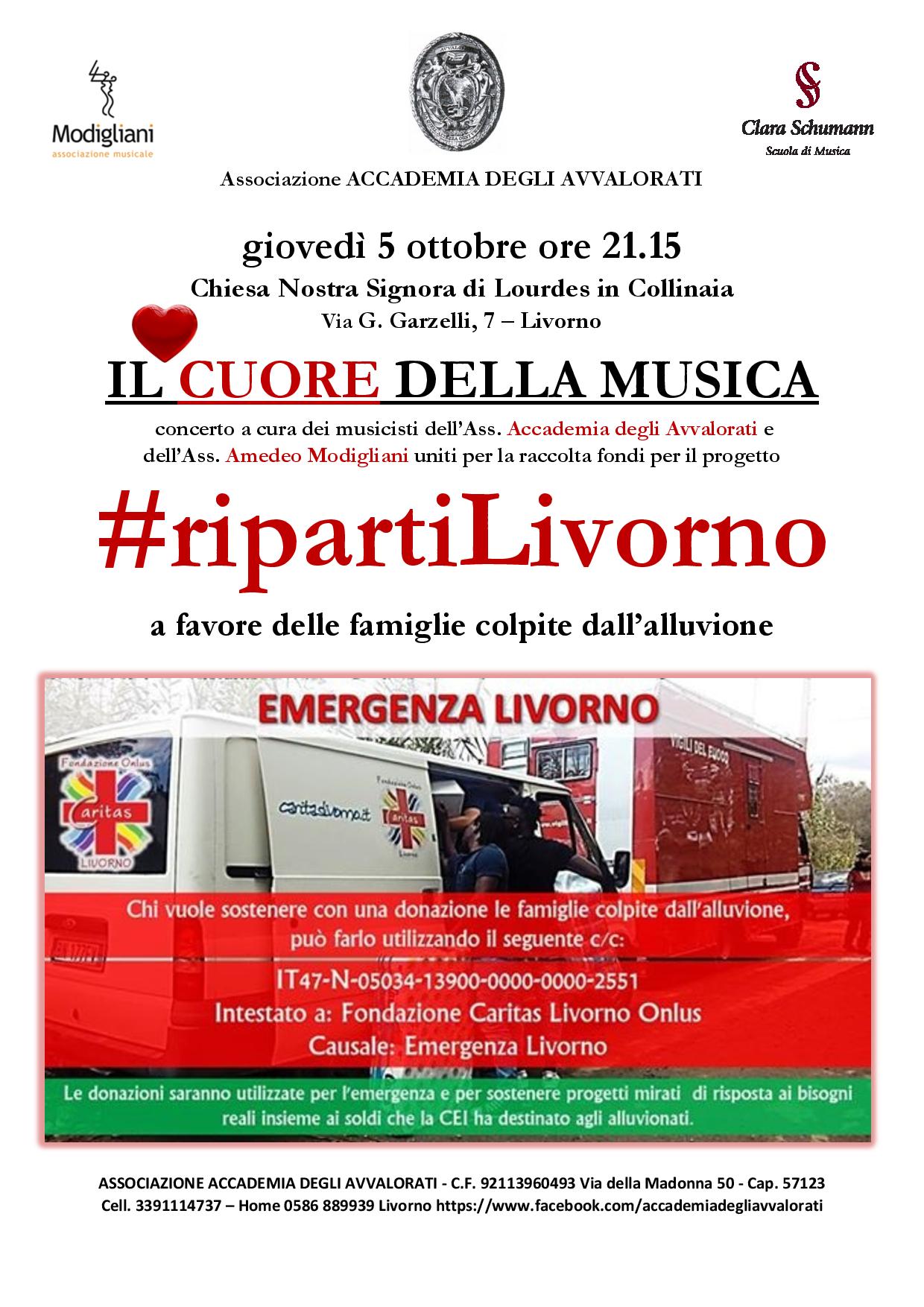L’Associazione Accademia degli Avvalorati con il patrocinio e la compartecipazione dell’Ass. Amedeo Modigliani  e la Scuola di Musica Clara Schumann ha scelto il progetto #ripartiLivorno ovvero la risposta della Fondazione Caritas Livorno  agli eventi dell’alluvione del 10 settembre scorso, per aiutare le famiglie colpite.