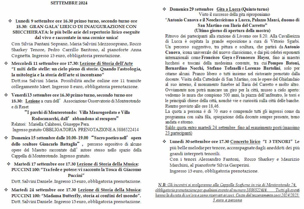 L’Associazione Cappella di Monterotondo ha preparato un ricco programma di eventi per il mese di settembre, tutti ospitati nella Cappella Scafurno in via di Monterotondo 74. Gli incontri, della durata di un’ora ciascuno, sono riservati ai soci dell’Associazione e rappresentano un’opportunità speciale per vivere la cultura in uno spazio intimo e ricco di storia.