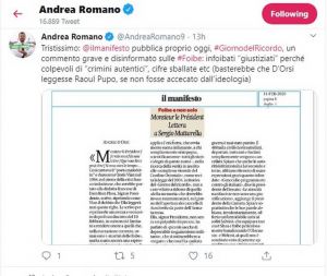 “Tristissimo: @ilmanifesto pubblica proprio oggi, #GiornodelRicordo, un commento grave e disinformato sulle #Foibe: infoibati “giustiziati” perché colpevoli di “crimini autentici”, cifre sballate etc (basterebbe che D’Orsi leggesse Raoul Pupo, se non fosse accecato dall’ideologia)“.