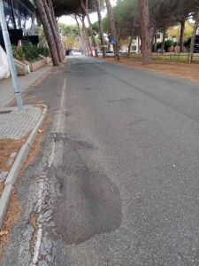 In entrambi i lati della strada, si notano notevoli rialzi, crepe e buche.