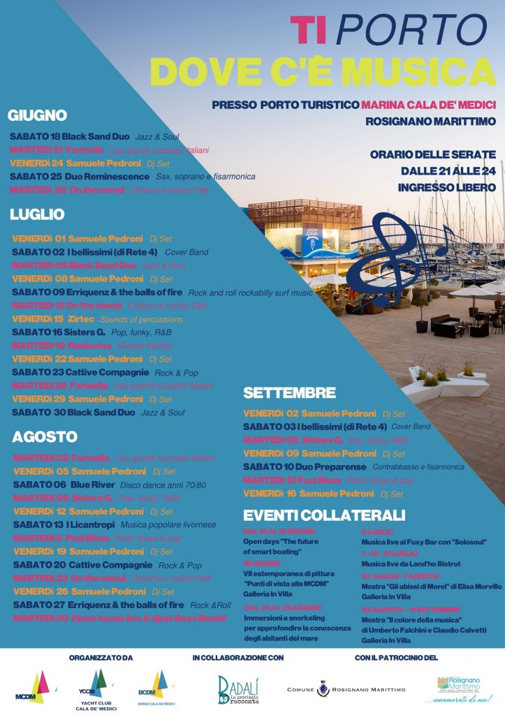 Il Porto turistico Cala de’ Medici di Rosignano presenta un’estate di musica ed eventi, da sabato 18 giugno a venerdì 16 settembre, tre serate di musica live a settimana, nella piazzetta del porto, per un totale di 39 date da segnare in agenda.