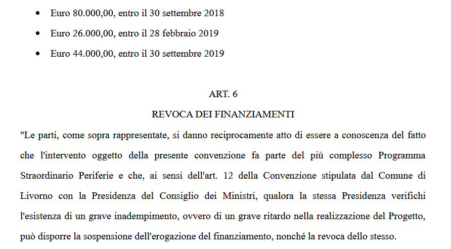 Il giorno successivo, con la deliberazione n.533, i numeri cambiano e di molto. La “collaborazione” del giorno precedente diventa infatti una “Convenzione tra il Comune di Livorno e la Fondazione teatro della città di Livorno Carlo Goldoni per la realizzazione dell’intervento “arte e teatro nelle periferie“. L’intervento è (o meglio era) coperto dal programma per la “riqualificazione urbana e la sicurezza delle periferie (DPCM 25/06/2016) – finanziato dalla Presidenza del Consiglio dei Ministri per il Comune di Livorno con complessivi € 17.827.530. Questo capitolo è noto come “Bando Periferie” ed è stato attualmente bloccato dal Governo. Poco male, potremmo dire, visto che l’impegno del Comune è di 432 euro. No. Con la delibera 533 l’impegno sale a 150mila euro.