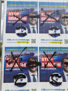 A Piombino nella notte sono stati imbrattati i manifesti elettorali della Lega e sono comparse scritte ingiuriose contro il nostro segretario Matteo Salvini. Evidentemente da fastidio che da ministro dell’Interno abbia combattuto davvero gli scafisti ed i mercanti di esseri umani.