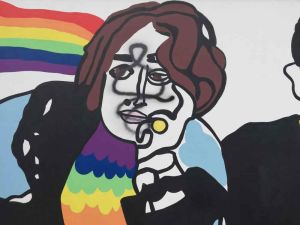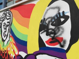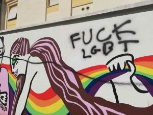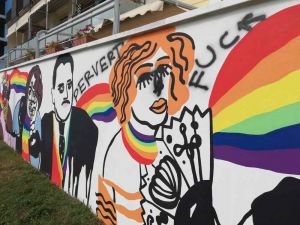 Scritte omolesbobitransfobiche sul murale raffigurante i volti di 17 icone LGBTQIA+