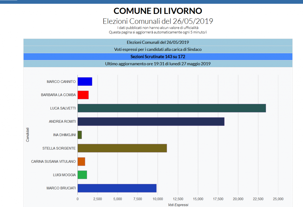 Scrutini così lenti a Livorno non capitavano da anni. Quasi sei ore per un conteggio che in condizioni normali impiega due ore. Mancano 29 sezioni al termine, ma il quadro è ormai definito. Sarà ballottaggio tra Salvetti e Romiti. Crollo per i Cinque Stelle e delusione per Fratelli d’Italia, che esprime il sindaco ma è asfaltato dalla Lega che prende quasi 7 volte i voti del partito della Meloni. Buon exploit del PD che sopravanza la Lega di quasi 10 punti.