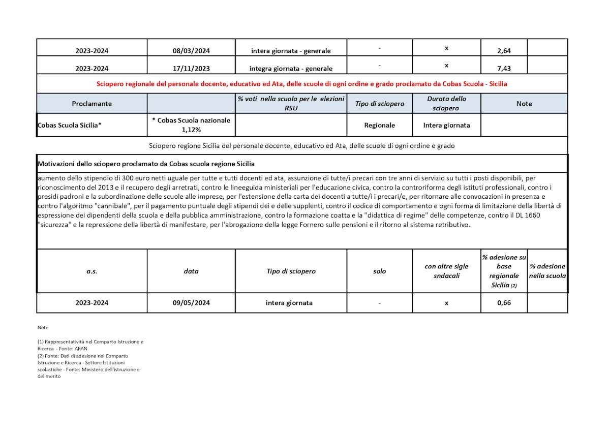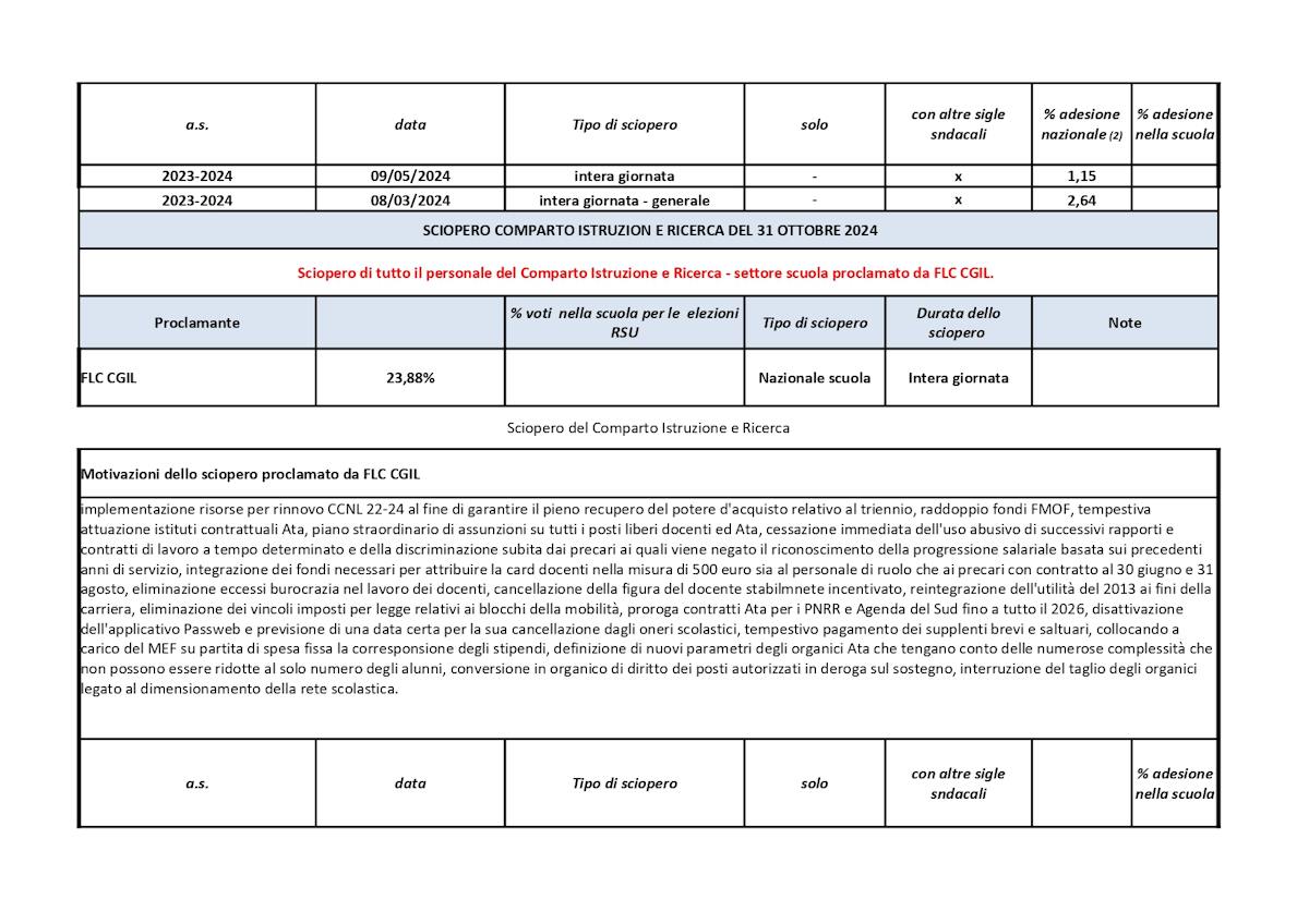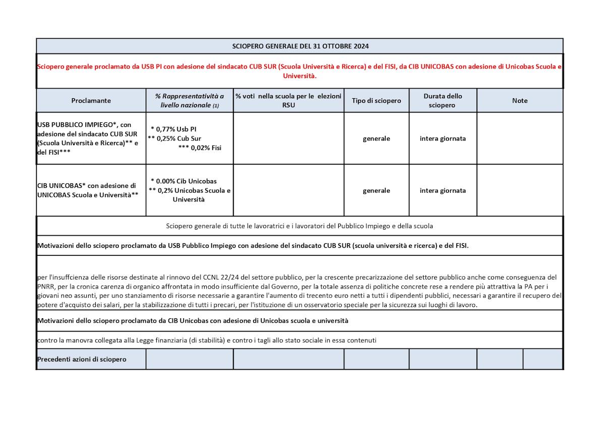 Per l’intera giornata del 31 ottobre 2024 è previsto uno sciopero generale di tutti i lavoratori del pubblico impiego e della scuola, proclamato USB Pl. con adesione di FISI e CUB SUR, da CIB UNICOAS. con adesione di UNICOBAS Scuola e Università, uno sciopero di tutto il personale del Comparto e Ricerca – Settore Scuola, proclamato FLC CGIL e uno sciopero regionale del Compano Istruzione e Ricerca – Settore Scuola proclamato Cobas Scuola Sicilia.