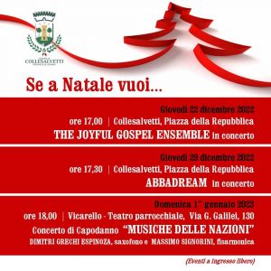 “Se a Natale vuoi…” si aprirà alle ore 17.00 di giovedì 22 dicembre, in piazza della Repubblica a Collesalvetti con “The Joyful Gospel Ensemble”: vent’anni di musica gospel e spiritual unita a grandi successi internazionali riproposti attraverso lo stile musicale inconfondibile di questo coro diretto da Riccardo Pagni e conosciuto anche oltre i confini della Toscana.