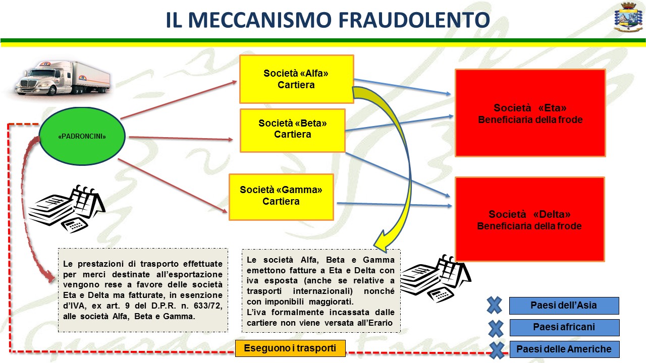 le società beneficiarie della frode commissionavano a piccoli imprenditori (c.d. “padroncini”, aventi sede in varie regioni italiane, quali la Toscana, la Calabria, la Sicilia e la Sardegna) l’esecuzione per loro conto di trasporti internazionali (non imponibili IVA ai sensi dell’art. 9 del D.P.R. 633/72) di prodotti (principalmente manufatti in pelle, carta, carne e prodotti alimentari) destinati a Paesi esteri (Centro e Nord America, America del Sud, Africa settentrionale e centrale, Cina, ecc.) e consegnati per l’imbarco presso i porti di Livorno e Civitavecchia, dando disposizioni affinché le relative fatture (che non recavano IVA esposta) dovessero essere emesse a favore di tre imprese “cartiere” (una ditta individuale e due società di capitali), appositamente costituite per “filtrare” tali transazioni commerciali;