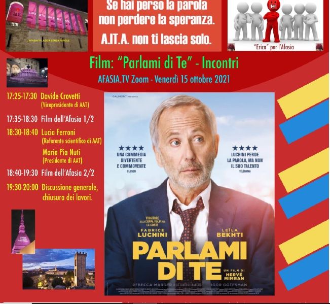 – Venerdì 15 ottobre – Evento satellite dalle ore 17:25 alle 20:00 – Film spot dell’Afasia “PARLAMI DI TE” – AFASIA.TV On-line Zoom – (€. 2,99)