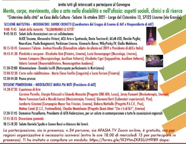 – Sabato 16 ottobre dalle ore 9:00 alle 18:30 – Convegno XIV Giornata Nazionale dall’Afasia – Il Cisternino di città – Largo del Cisternino 13, Livorno – Gratis (capienza n.34 persone)