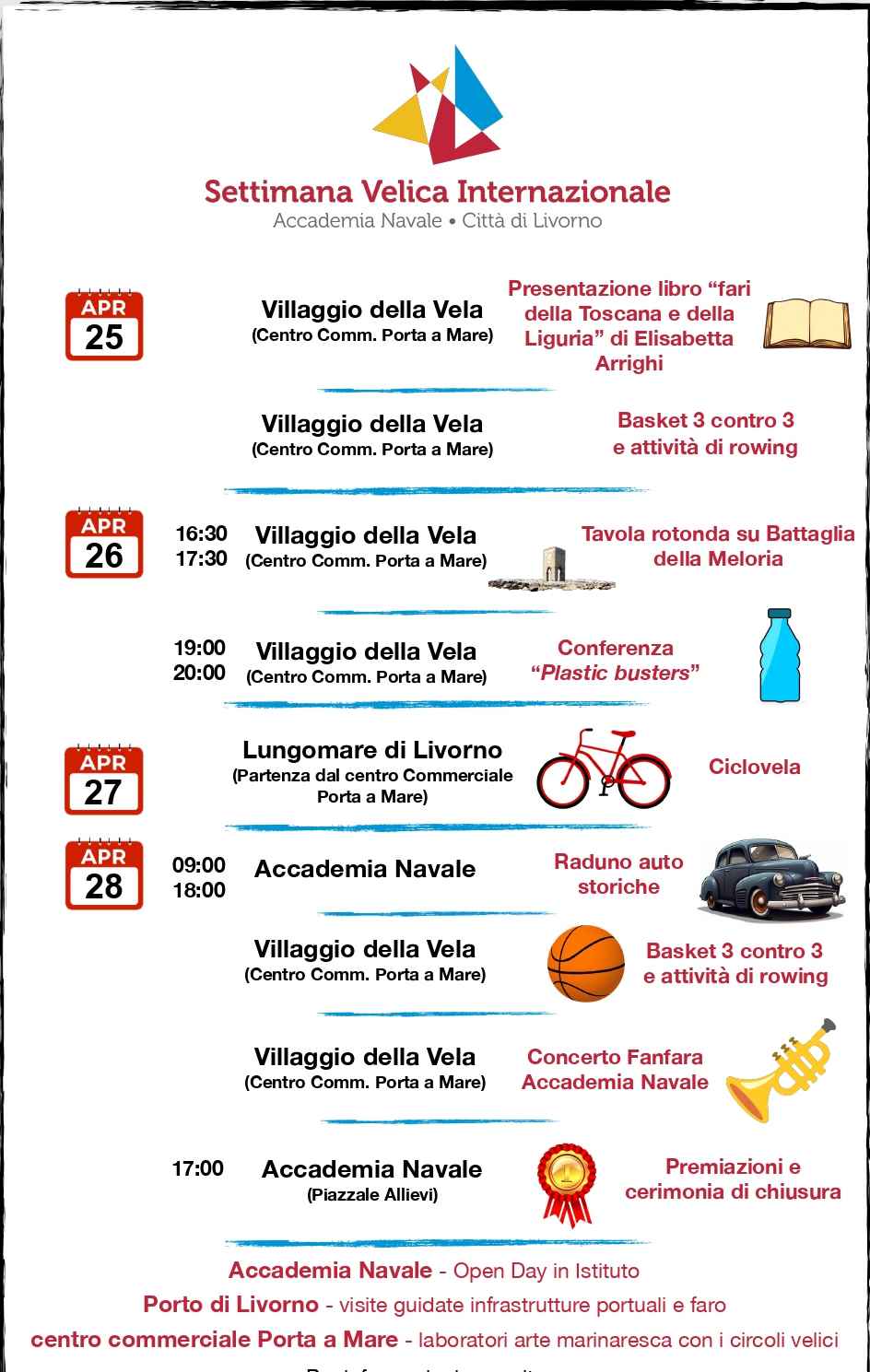 La Settimana Velica Internazionale (SVI) si avvicina. In previsione dell’imminente avvio, che avrà luogo a Livorno dal 20 al 28 Aprile prossimi venturi, si allegano il programma delle regate e degli eventi collaterali fin qui confermati