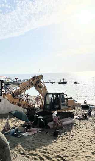 Sicurezza, in spiaggia con ombrellone e asciugamano sotto la pala della ruspa