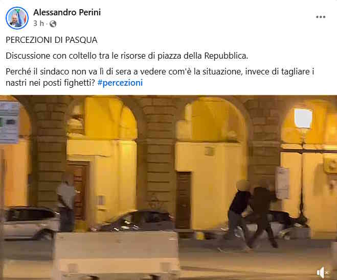 Il consigliere Perini accompagna il video con un commento diretto e molto polemico: «PERCEZIONI DI PASQUA. Discussione con coltello tra le risorse di piazza della Repubblica. Perché il sindaco non va lì di sera a vedere com’è la situazione, invece di tagliare i nastri nei posti fighetti?»