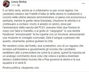 “È un fatto serio, anche se ci scherziamo su per ovvie ragioni, l’ex candidato sindaco dei Fratelli d’Italia (e della destra in coalizione) a Livorno nelle ultime elezioni amministrative, in piena crisi economica e sanitaria, mentre la gente viene licenziata, chiudono le attività e si continuano a contare i morti, è andato in centro, dove per l’anniversario della nascita del PCd’I, avevano tinto due fioriere di rosso con falce e martello, e al grido di “vergogna!” in una diretta Facebook “emozionante” le ha coperte con un tricolore, annunciando una mozione in consiglio comunale. Gela il sangue a pensare che questo, veramente, poteva guidare la città.