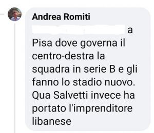 Per rendersi conto del livello, due screenshot, uno di un ragazzo che ironizza sull’iniziativa e giustamente gli ricorda che i problemi sarebbero altri a prescindere da come la si pensi, quindi la risposta ad un analogo commento dove colui che voleva e poteva diventare sindaco (rabbrividire) ricorda che a Pisa governa la destra e la sua squadra è in serie B