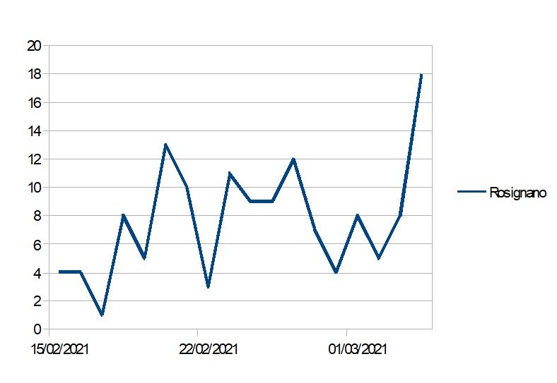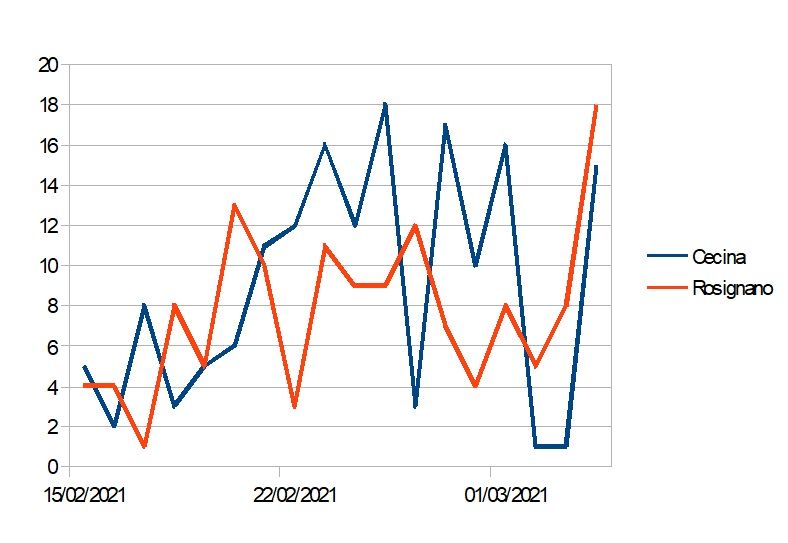 Dal giorno 15 febbraio al 4 marzo si sono registrati un totale di 525 positivi a Livorno; 161 positivi a Cecina; 54 positivi a Collesalvetti; 87 positivi a Piombino; 139 positivi a Rosignano Marittimo;