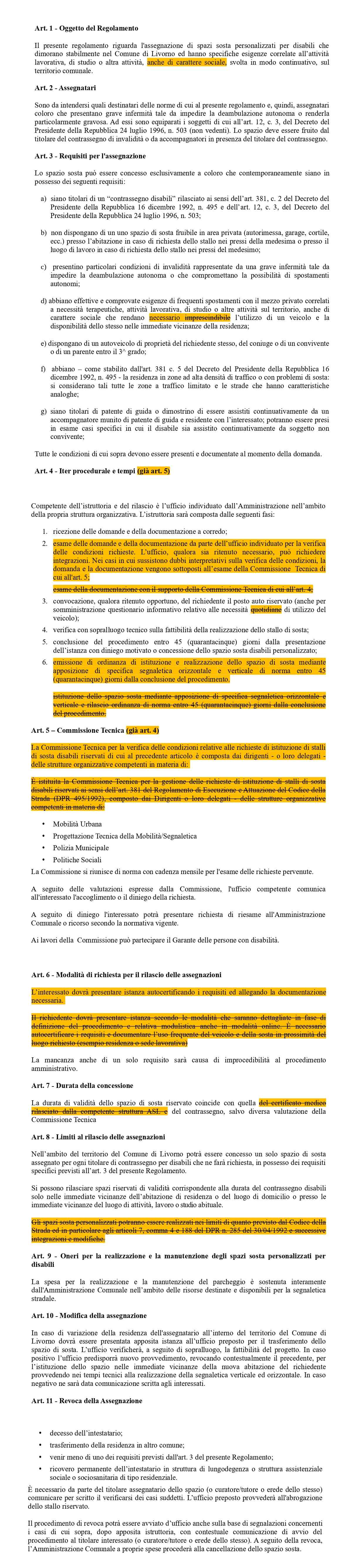Al termine dell’articolo il nuovo regolamento spazi disabili personalizzati confrontato con il regolamento precedente. Evidenziate in giallo le aggiunte, modifiche e cancellazioni