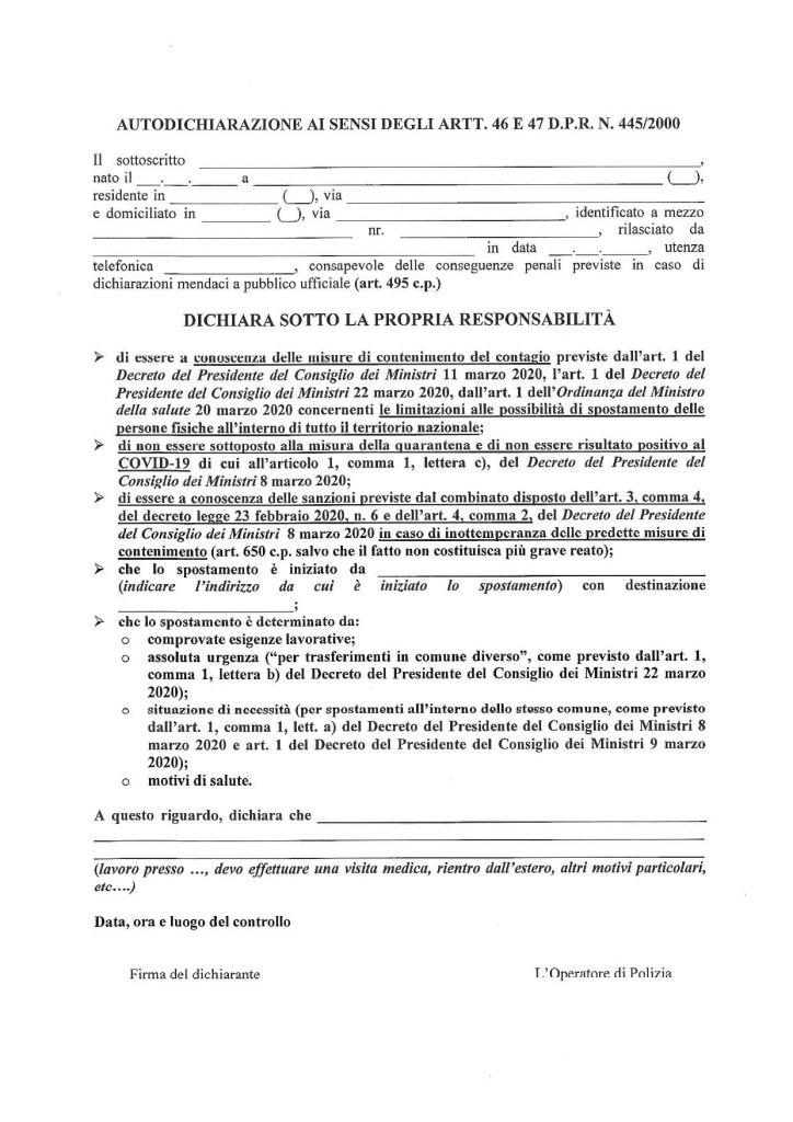 Livorno, 24 marzo 2020 – Spostamenti in e fuori città: ecco il nuovo modulo modificato in base al decreto del 22 marzo u.s.. Potete scaricarlo QUI oppure stampare l’immagine che segue: