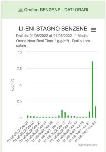 La sera del 1 agosto, sera l’unica centralina Arpat a disposizione per gli abitati di Stagno e del Villaggio Emilio ha rilevato un picco in media oraria alle ore 22:00 pari a 8.6 µg/m³ di benzene. http://www.arpat.toscana.it/temi-ambientali/aria/qualita-aria/rete_monitoraggio/scheda_stazione/LI-ENI-STAGNO