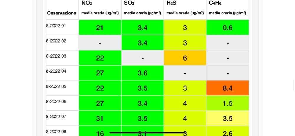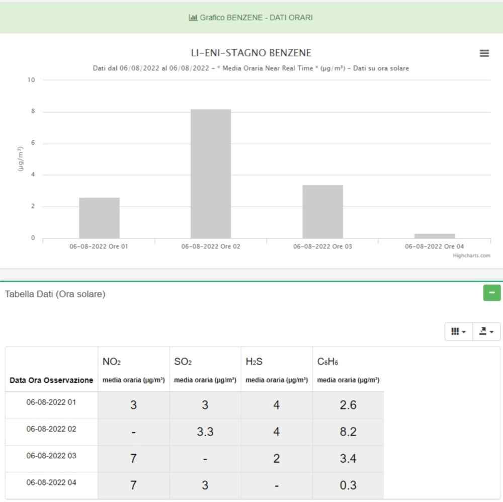 Il benzene risulta essere pari a 2,6 µg/m³ di media oraria alle ore 1 di mattina del 6 agosto 2022 per poi salire a 8,2 µg/m³ di media oraria alle ore 2 e scendere a 3,4 µg/m³ di media oraria alle ore 3.
