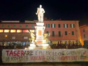 Striscione di protesta contro il Taser, ex caserma occupata:”il taser è una forma di tortura che causa dolore estremo”