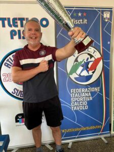 Fondamentale il suo contributo per il successo dei Campionati Italiani del 2023, organizzati a Pisa, che hanno visto la partecipazione di oltre 50 squadre e che sono stati lodati in tutta Italia per l’ottima organizzazione, culminando nella realizzazione di una t-shirt celebrativa venduta in oltre 150 esemplari, inclusi acquirenti dal Regno Unito, la patria natia del Subbuteo.