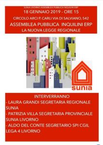 Livorno, 17 gennaio 2019 – Il prossimo 18 gennaio alle ore 15 è in programma l’assemblea pubblica inquilini Erp dedicata alla nuova legge regionale. L’iniziativa si terrà presso il circolo Arci P.Carli in via di Salviano 542. Interverranno Laura Grandi (segretaria regionale Sunia), Patrizia Villa (segretaria provinciale Sunia), Aldo Del Conte (segretario Spi-Cgil Lega 4 Livorno). L’assemblea, convocata da Grandi e Villa, rappresenta il primo di una serie di incontri del Sunia con gli inquilini Erp di tutta la provincia per informare sulle principali modifiche della nuova legge regionale, ascoltare e condividere le problematiche sentite da cittadini e cittadine.